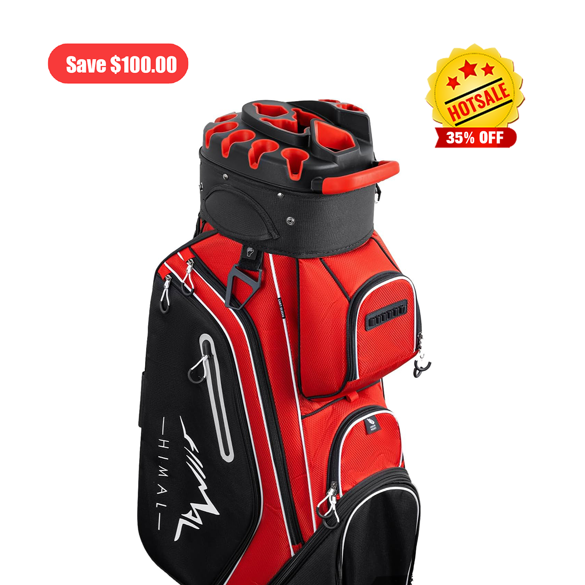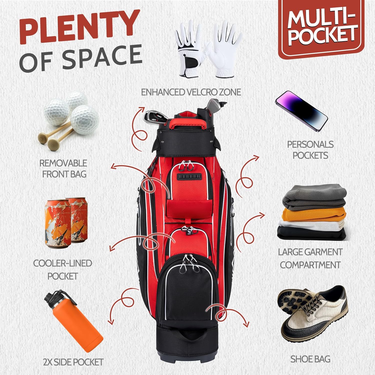 Ample Storage: With multiple pockets, including a spacious apparel pocket, cooler pocket, valuables pocket, and more, this golf cart bag offers ample storage space for your golf essentials, snacks, beverages, and personal items.