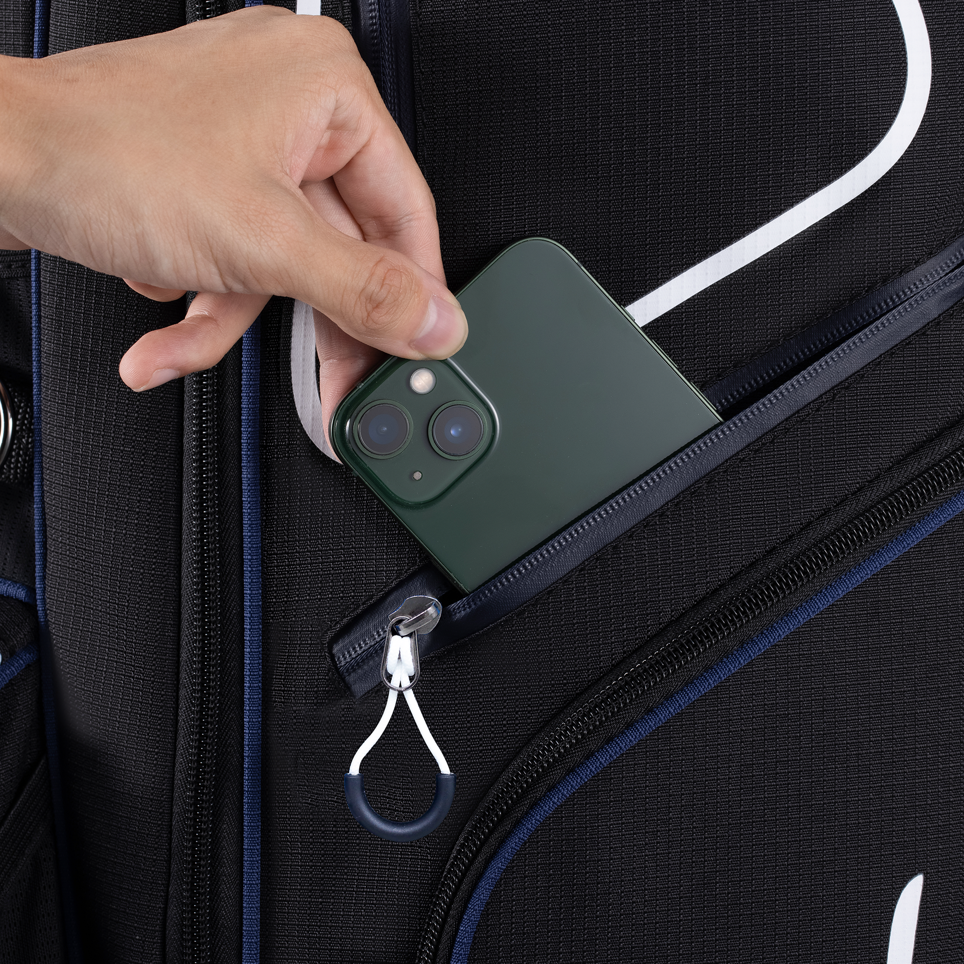 Tailored Storage Mastery: Elevate your organizational prowess with our 10 versatile pockets. Revel in refreshment with the dedicated cooler pocket, the shoe compartment ensures your golf shoe is apart from your clubs. The rain hood cover and towel ring with Velcro glove attachment are thoughtful designs.