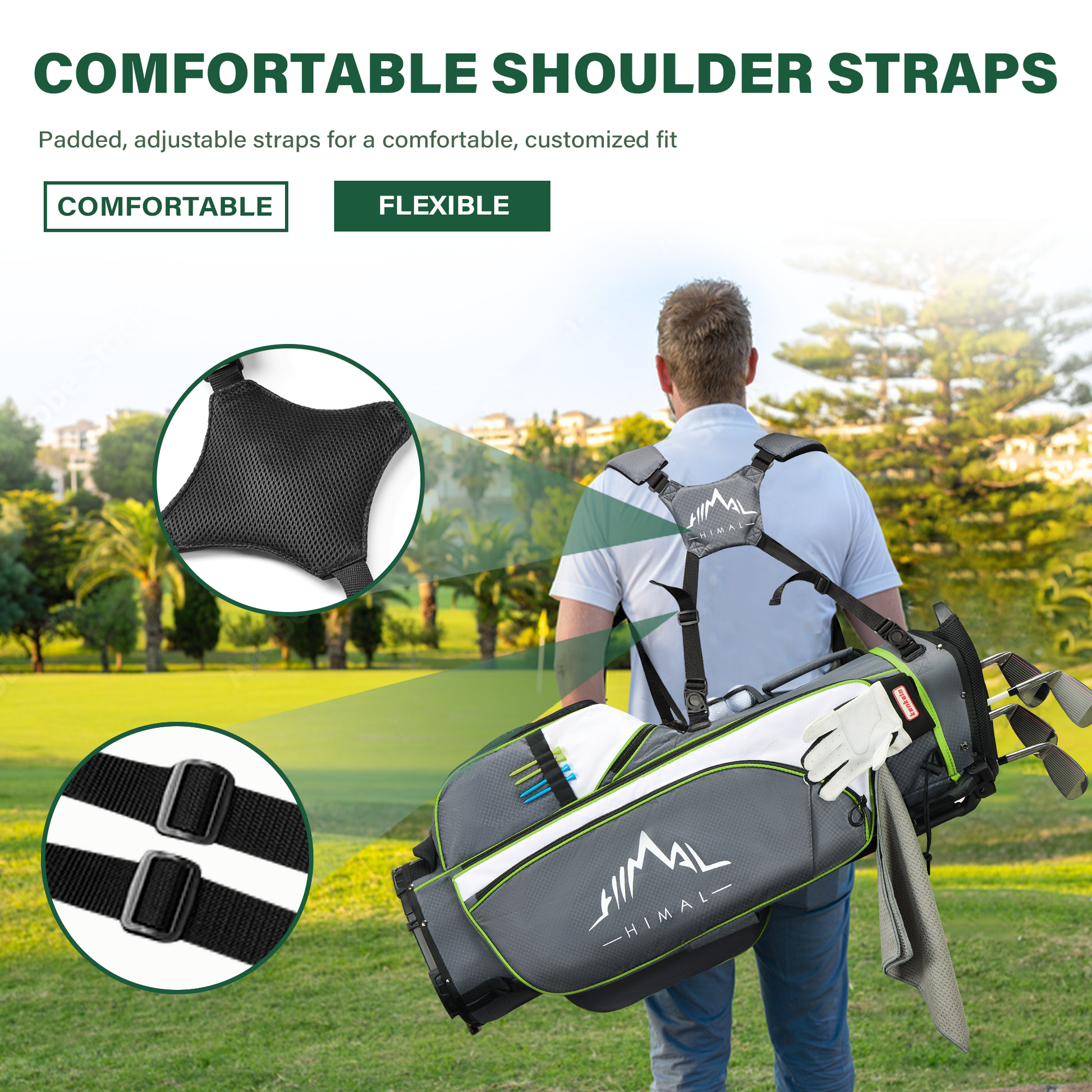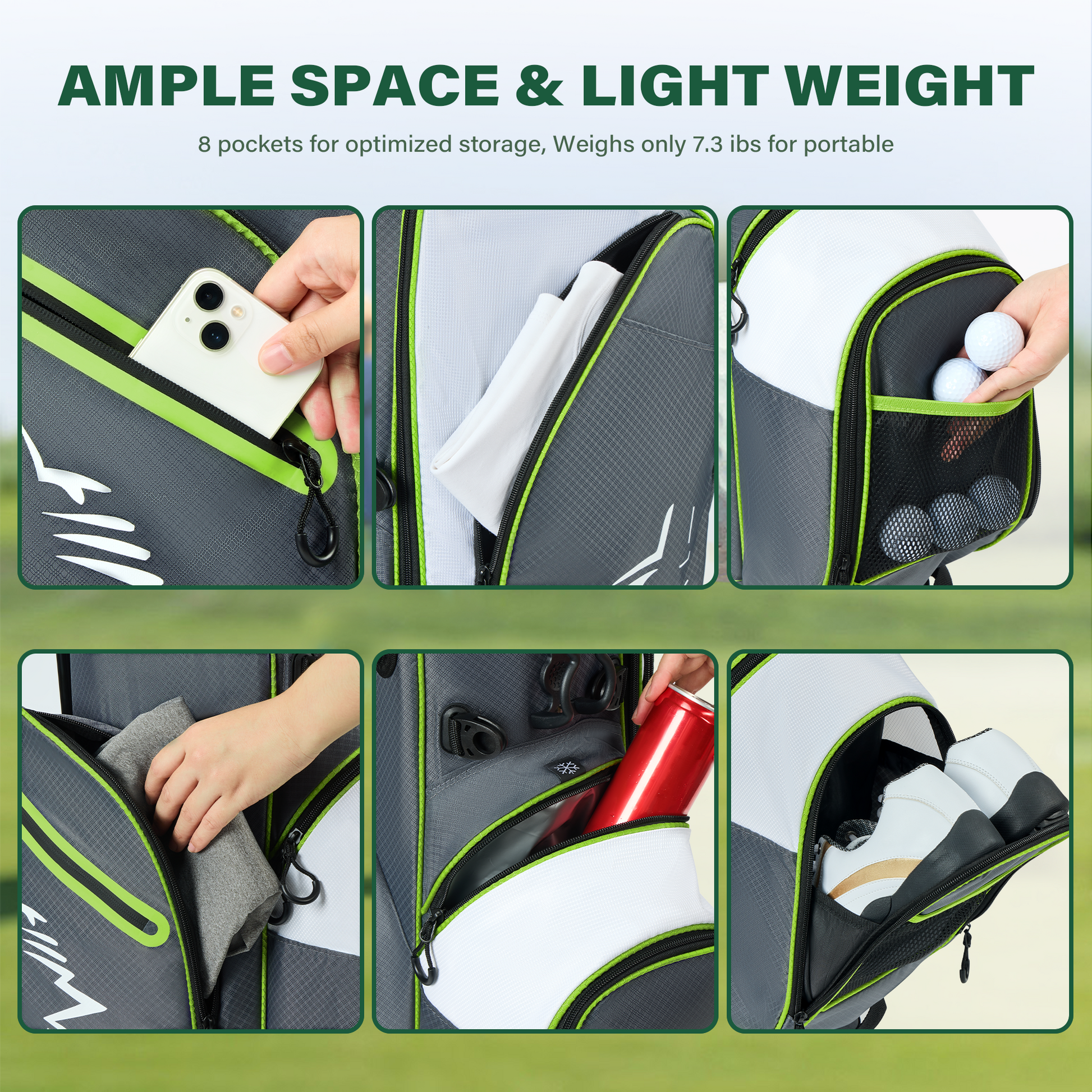 Ample Storage Space: This golf bag , equipped with 8 pockets, including side pockets for clothing, an insulated cooler for keeping your drinks cool, and front pockets for tees and accessories—perfect for core golfing needs