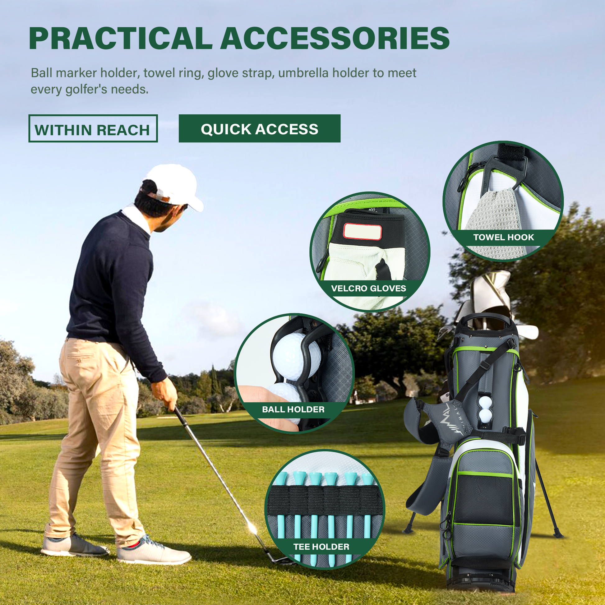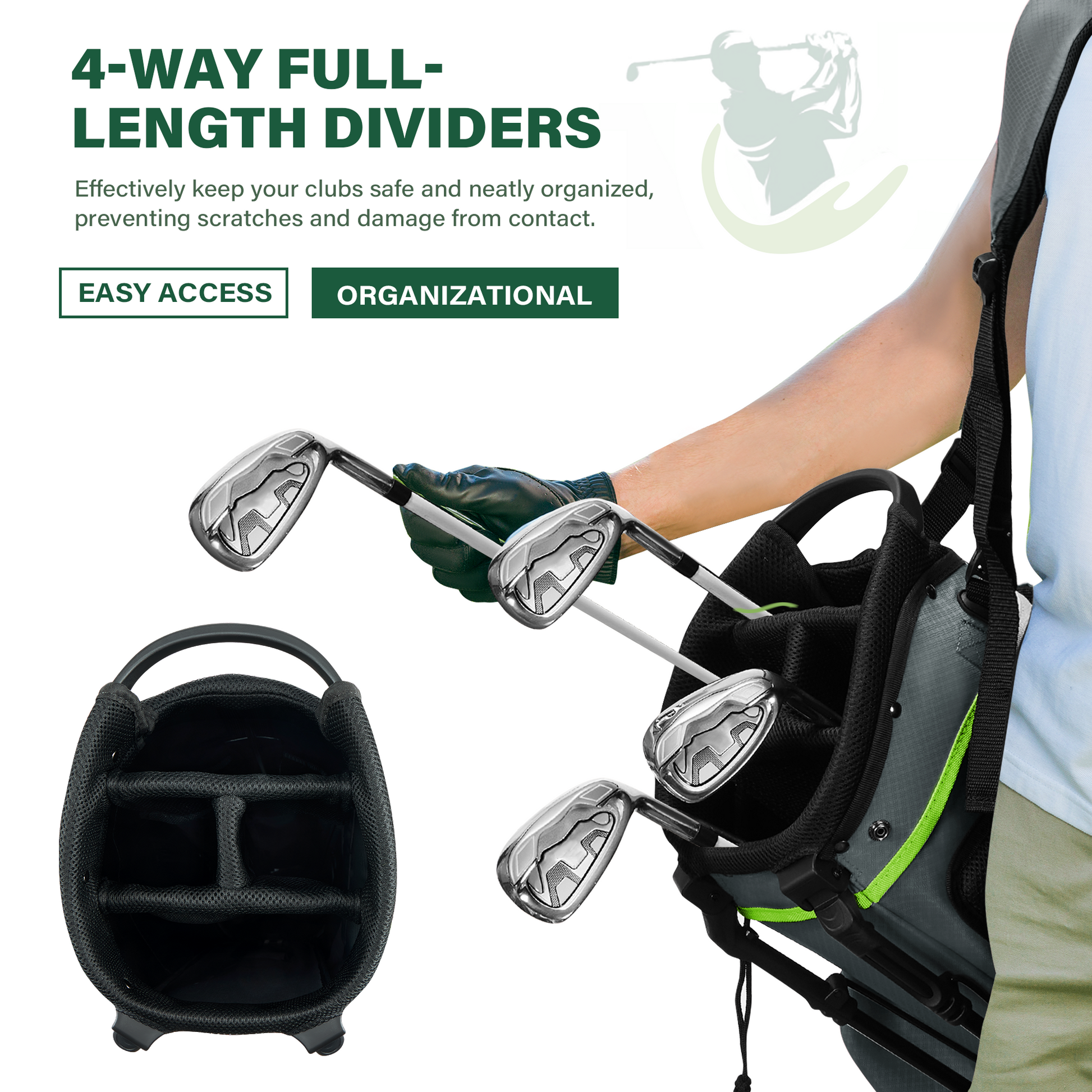 4-Way Dividers: Designed with full-length 4-way dividers, the UniHimal golf stand Bag reduces club friction to avoid scratches and damage, keeping clubs organized and protected. Ideal for both seasoned golfers and beginners, it accommodates 6-8 clubs for easy retrieval during practice or casual rounds